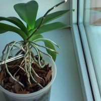 Alle Abschnitte werden mit Holzasche oder Wasserstoffperoxid behandelt. Geteilte Orchideen in neues Substrat pflanzen. Während der Wurzelzeit sollten Orchideen täglich gegossen oder besprüht werden. Das Erscheinen neuer Triebe zeigt, dass die Orchidee Wurzeln geschlagen hat.