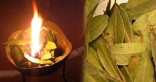 Verbrennen Sie 2 oder 3 Lorbeerblätter in einem Aschenbecher, lassen Sie sie einige Minuten lang von der Flamme verzehren und atmen Sie ihr Aroma ein.