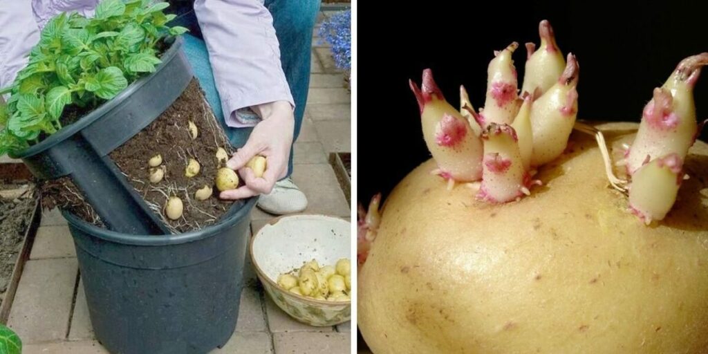 Wenn die Sprossen herauskommen, schneiden Sie die Kartoffeln in Stücke. Geben Sie in der Zwischenzeit die Blumenerde in den Topf. Vergraben Sie die Kartoffeln, indem Sie ein Stück über die Oberfläche hinausragen lassen.