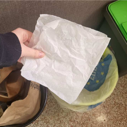 Der Fehler, den normalerweise jeder  macht,  besteht darin, Backpapier in den Mülleimer zu werfen,  getäuscht  durch das Wort „Papier“,  was die Leute glauben lässt, dass sie es in den Mülleimer werfen. Der Name täuscht also sicherlich und lässt vermuten, dass es auf jeden Fall in den Papierbehälter geworfen werden sollte, egal ob sauber oder schmutzig.